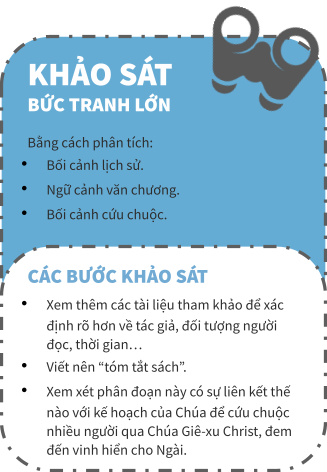 Đầu tiên hãy đọc qua phân đoạn Kinh Thánh và sau đó quay lại để quan sát từ đầu: Các nhân vật trong Kinh Thánh là ai? Chuyện gì đang diễn ra? Sự việc đang diễn ra ở đâu?